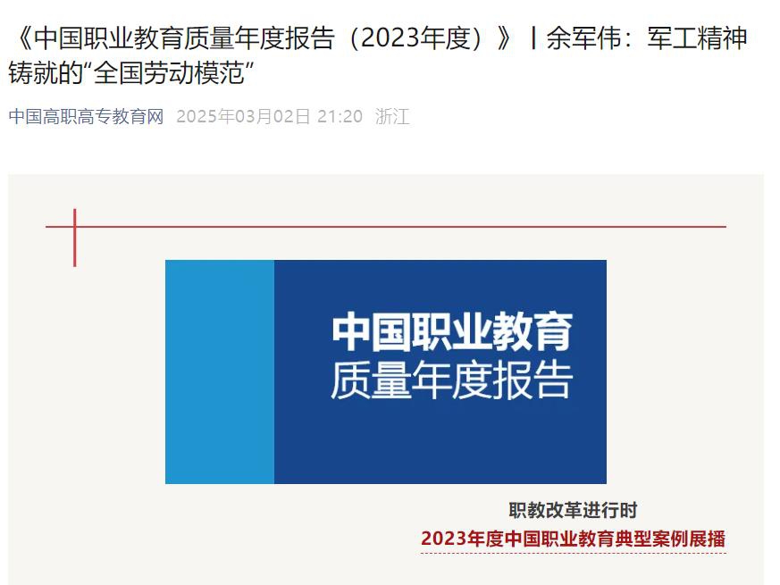 3月2日,中国高职高专教育网发布了《中国职业教育质量年度报告(2023年度)》丨余军伟:军工精神铸就的“全国劳动模范”专题典型案例,特别报道了我校2007届毕业生余军伟,用技能成就闪耀人生的技能成才、技能报国故事。(供稿/质量管理办公室 撰稿/曹辉 单位审核/于玲 编审/杨爽)