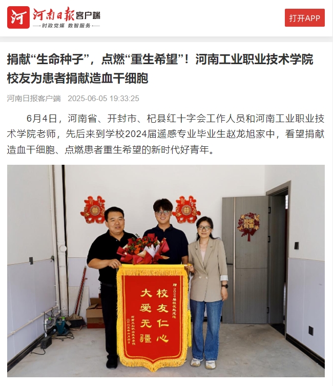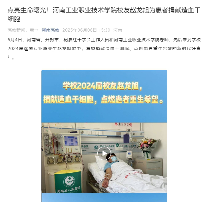 编者按:近日,学校2024届遥感专业毕业生赵龙旭,大一志愿加入中华骨髓库,如今捐献“生命种子”,为素不相识的血液病患者带来重生希望的事迹,受到社会广泛关注,河南省、开封市、杞县红十字会工作人员和学校老师先后前往赵龙旭家中看望慰问。6月5日、6日,河南日报、河南高教以“点亮生命曙光”为主题,对学校校友赵龙旭奉献人间大爱的事迹予以宣传报道。(供稿/党委宣传部 撰稿/刘天恒 部门审核/赵国峰 编审/杨爽)