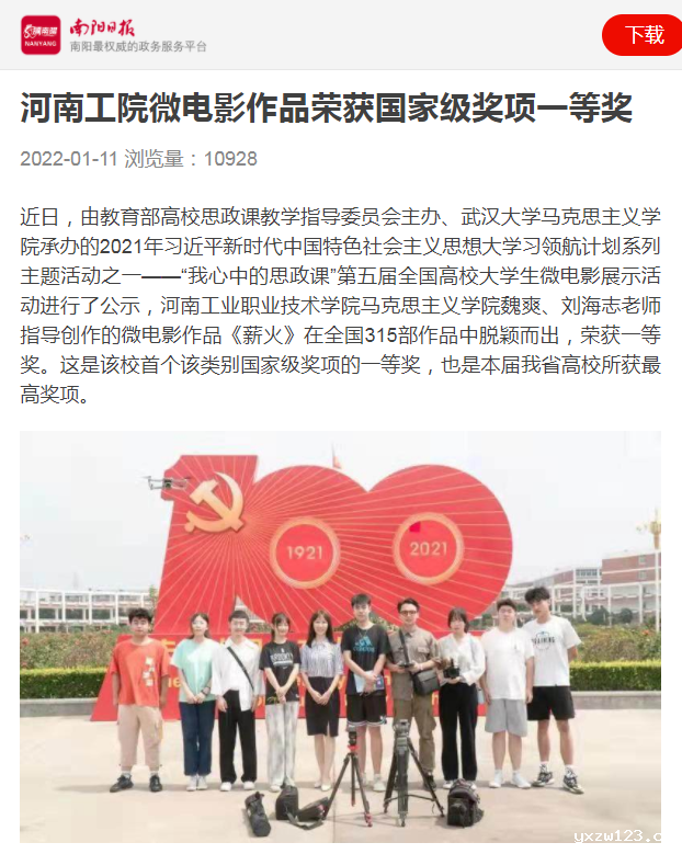 近日,由教育部高校思政课教学指导委员会主办、武汉大学马克思主义学院承办的2021年习近平新时代中国特色社会主义思想大学习领航计划系列主题活动之一—“我心中的思政课”第五届全国高校大学生微电影展示活动进行了公示,我校马克思主义学院魏爽、刘海志老师指导创作的微电影作品《薪火》在全国315部作品中脱颖而出,荣获一等奖,这是我校首个该类别国家级奖项的一等奖,也是本届我省高校所获最高奖项。南阳日报客户端、《南阳晚报》对我校微电影作品荣获国家级奖项一等奖情况进行了宣传报道。