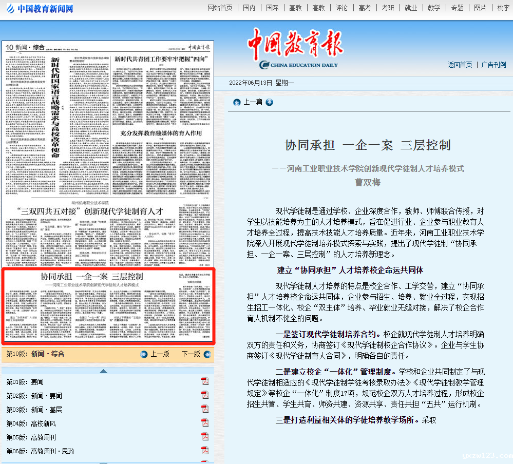 6月13日,《中国教育报》以《协同承担 一企一案 三层控制——竞技宝app官方下载创新现代学徒制人才培养模式》为题,全面报道学校深入开展现代学徒制培养模式探索与实践,提出了现代学徒制“协同承担、一企一案、三层控制”的人才培养新理念,在推广应用、人才培养质量、社会认可度等方面取得显著成效。