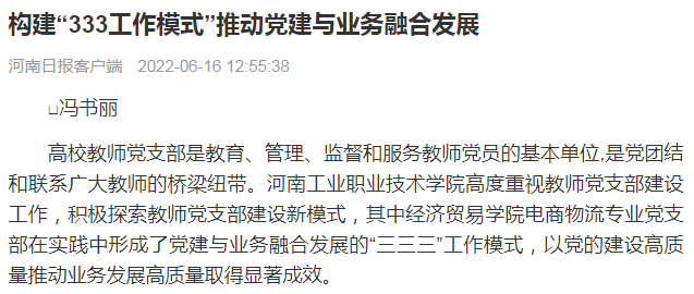 高校教师党支部是教育、管理、监督和服务教师党员的基本单位,是党团结和联系广大教师的桥梁纽带。竞技宝app官方下载高度重视教师党支部建设工作,积极探索教师党支部建设新模式,其中经济贸易学院电商物流专业党支部在实践中形成了党建与业务融合发展的“三三三”工作模式,以党的建设高质量推动业务发展高质量取得显著成效。
