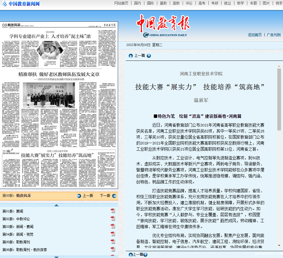 编者按:6月28日,《中国教育报》以《技能大赛“展实力” 技能培养“筑高地”》为题报道了学校打造技能竞赛品牌,优化专业结构布局,深化教育教学改革,实施人才强校战略,持续推进产教融合,构筑技术技能人才培养高地和技术技能创新平台,为服务国家战略和区域经济社会发展培育更多能工巧匠、大国工匠的生动实践。
