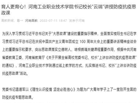 编者按:根据中共河南省委教育工委、河南省教育厅《关于开展全省高校党委书记、校长“上讲台讲防疫抗疫思政课”的通知》,近日,学校党委书记温道军以《理性认识疫情 坚定必胜信心》、校长王伟以《汇聚师生抗疫力量 书写战疫竞技宝app专业glubet答卷》为题,通过线上教学的方式,为广大青年学子上了一堂别开生面的防疫抗疫专题思政课。7月11日,河南高教报道了学校防疫抗疫思政课开展情况。(供稿/党委宣传部 撰稿/杨爽 单位审核/杨俊峰 编审/袁贤)