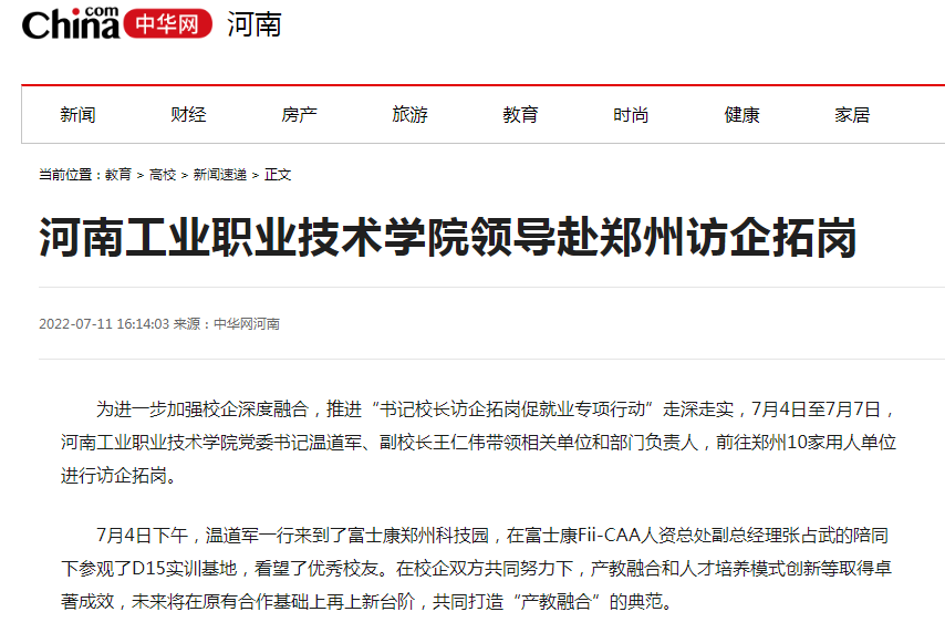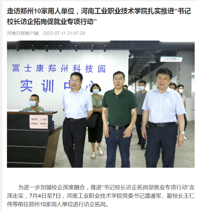 编者按:为贯彻落实《教育部办公厅关于开展全国高校书记校长访企拓岗促就业专项行动的通知》文件精神,进一步推进毕业生就业工作,加强校企合作,拓宽就业渠道,全面提升就业质量,7月4日至7日,学校党委书记温道军、副校长王仁伟等前往郑州10家用人单位进行访企拓岗。近日,河南日报、中华网、河南高校咨询网等媒体对学校扎实开展“书记校长访企拓岗促就业专项行动”进行了广泛报道。(供稿/党委宣传部 撰稿/于慧 单位审核/杨俊峰 编审/杨爽)