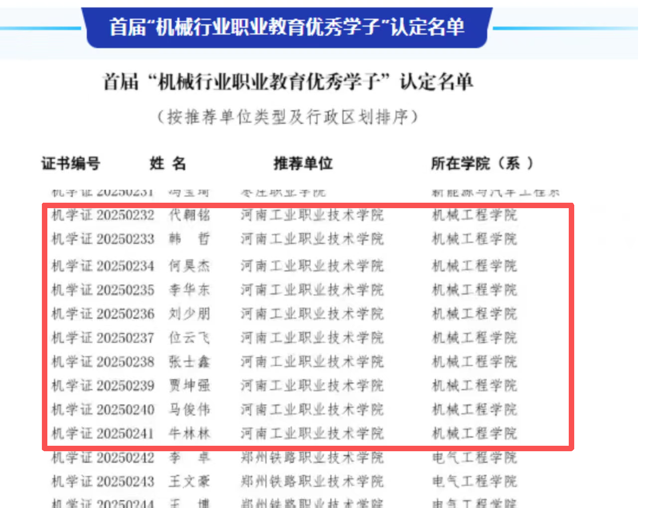 首届“机械行业职业教育优秀学子”评选由机械工业教育发展中心联合全国机械职业教育教学指导委员会等权威机构共同组织,旨在为制造强国战略选拔和储备高技能人才。本次评选面向全国机械行业职业院校2025届毕业生,经过严格的院校推荐、专家评审和公示程序,最终仅有496名学子获此殊荣。本届评选竞争激烈,机械工程学院10名学子同时入选,入选规模在全国院校中名列前茅,充分彰显了学院扎实的育人成效和卓越的人才培养质量。