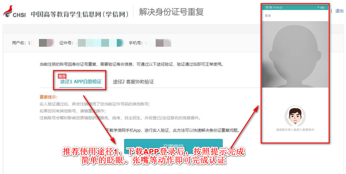 方法1:下载APP,用注册的账号登录,根据提示完成相应的动作即可。后台会将真人与高考采集的照片做对比,如果发型、胖瘦、化妆导致差距太大无法认证,请使用方法2。