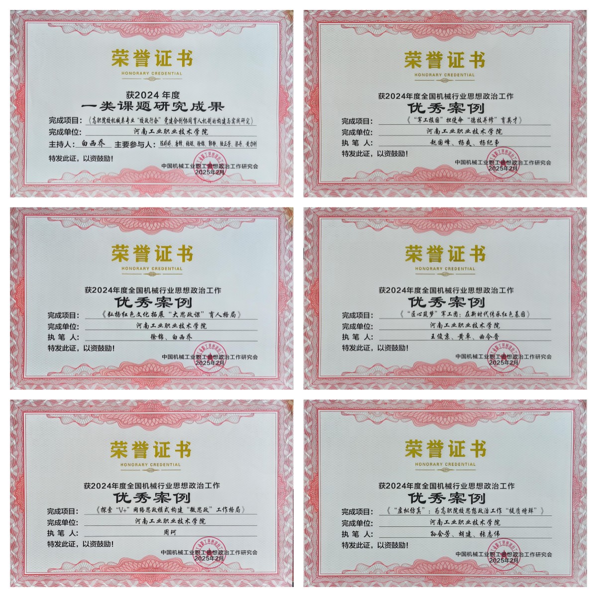 在此次大会上,我校荣获“2024年度组织推荐课题研究成果突出单位”。课题《高职院校机械类专业“校政行企” 党建合创协同育人机制的构建与实践研究》荣获2024年度“一类课题研究成果”,学校推选案例《“军工报国”担使命 “德技并修”育英才》《弘扬红色文化 拓展“大思政课”育人格局》荣获机械行业职业教育思想政治工作优秀案例一等奖,《“匠心筑梦”军工团: 在新时代传承红色基因》《探索“V+”网络思政模式 构建“微思政”工作格局》《虚拟仿真”:为高职院校思想政治工作“提质增鲜”》荣获优秀案例二等奖。