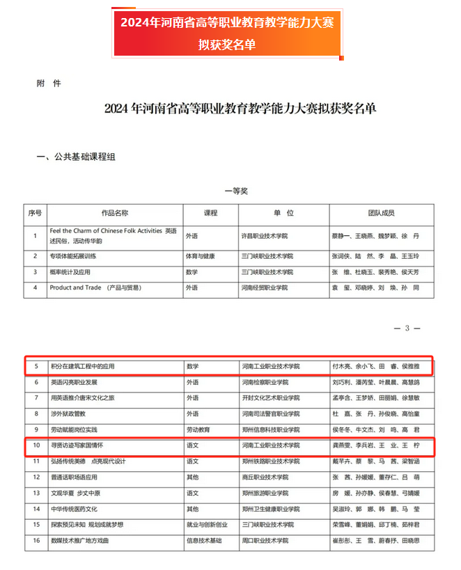 基础科学教学部《高职数学》《高职语文》教学团队分获河南省高等职业教育教学能力大赛一等奖