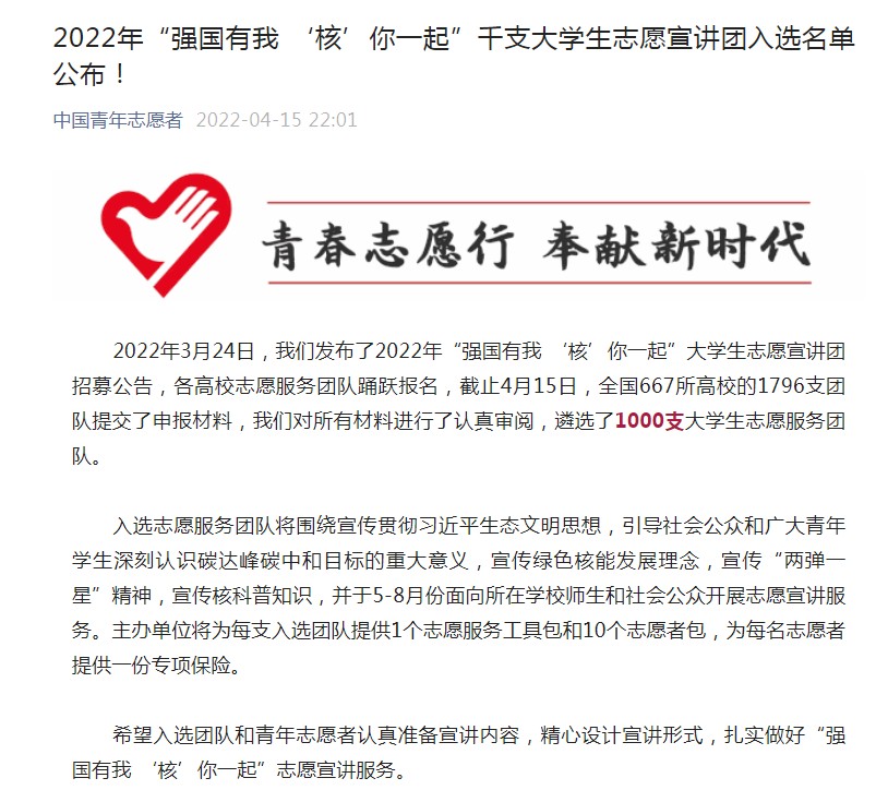 为深入宣传贯彻习近平生态文明思想,引导社会公众和广大青年学生深入理解“碳达峰、碳中和”的深刻内涵和重大意义,团中央青年志愿者行动指导中心、中国核工业集团有限公司、中国青年志愿者协会秘书处联合开展“强国有我 ‘核’你一起”大学生志愿宣讲活动,具体工作由全国学校共青团研究中心、中国核工业集团有限公司团委共同承办。