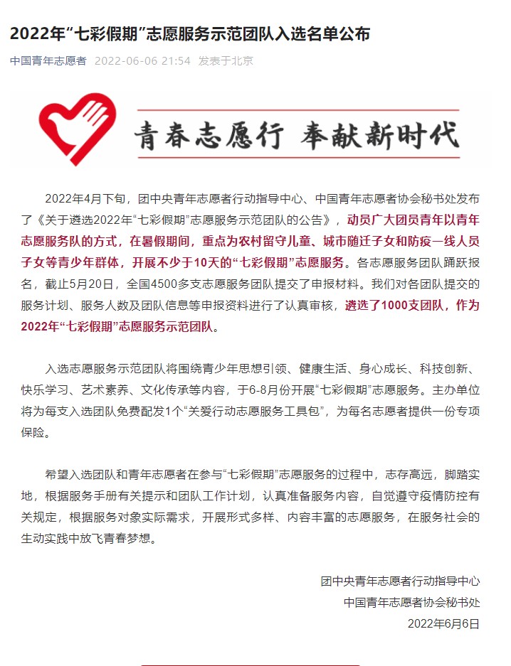 为进一步加强对农村留守儿童、城市随迁子女等青少年群体的关心关爱,弘扬志愿服务精神,团中央青年志愿者行动指导中心、中国青年志愿者协会秘书处面向全国遴选一批2022年“七彩假期”志愿服务示范团队。