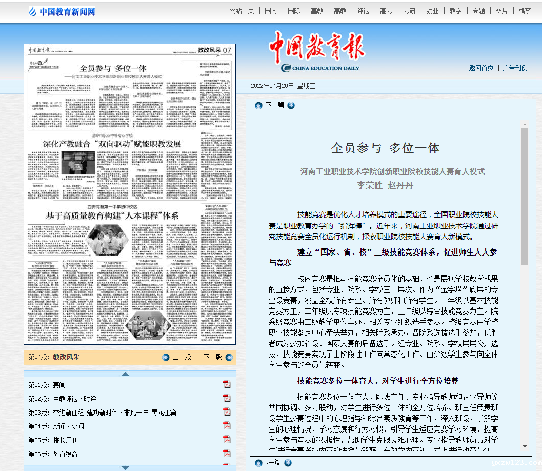 编者按:7月20日,《中国教育报》以《全员参与 多位一体——竞技宝app官方下载创新职业院校技能大赛育人模式》为题,全面报道学校深入开展技能大赛全员化育人模式的探索与实践。文章总结了学校“建立三级技能竞赛体系、技能竞赛多位一体育人、重构赛教融合课程体系、创新考核评价方式”的技能大赛育人新模式,为全面推进教育教学改革发展、人才培养质量提升,打造技术技能人才培养高地,提供了生动的实践经验。