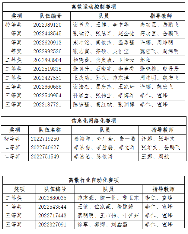 经过紧张的日夜奋战,我校在“西门子杯”中国智能制造挑战赛全国初赛高职组取得优异成绩,离散运动控制赛项全国初赛:特等奖1项,一等奖3项,二等奖3项,三等奖3项;信息化网络赛项全国初赛:特等奖1项,二等奖2项;离散自动化赛项全国初赛:二等奖2项,三等奖2项。