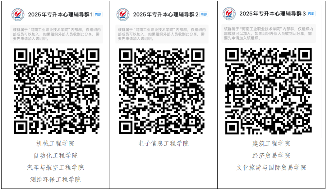 请各学院高度重视,安排专人负责,通知专升本学生扫对应二维码提前进群,确保考生按时参加讲座,并在培训期间做好考勤管理。