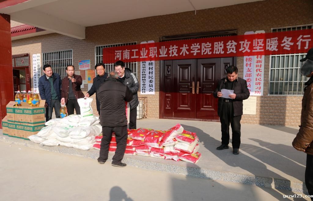 1月23日,党委委员、副校长王仁伟、党委委员、组织部长朱云松和组织部、离退处、产教融合中心相关人员到方城县杨集乡李楼村、河坡村走访慰问贫困户及看望驻村干部,我校挂职方城县委常委、副县长李荣胜书记和杨集乡人大主席李成飞一同走访慰问。